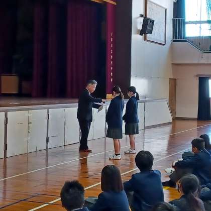 ・今日は、1、2年生の修了式、生徒会認証式、部活動の表彰を行いました。