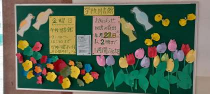 4月26日(金) ・学校司書の方が、図書室の前にきれいに飾り付けをしています。