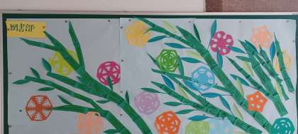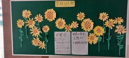 ・学校司書の方が、図書室の前にきれいに飾り付けをしています。