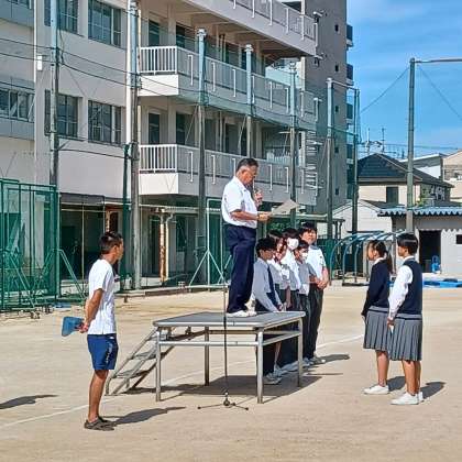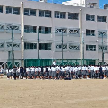 ・今日は、晴天のなか全校集会、表彰を行いました。