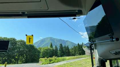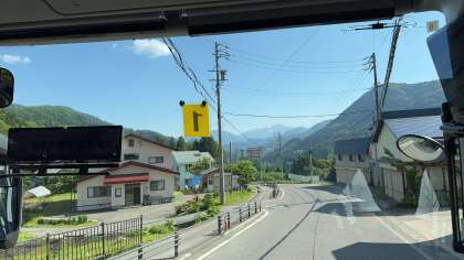 ・宿舎を出発し、次の目的地に向かい、バスで移動しています。