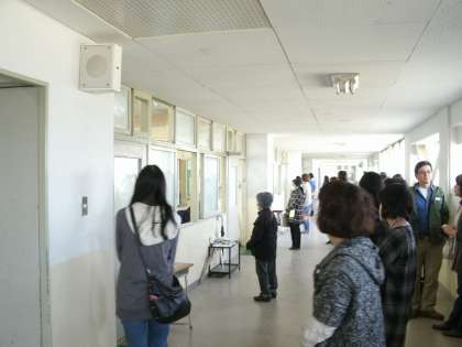 3年生の教室前の廊下から保護者の方は授業をみています。