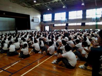 陸上部走り幅跳びの表彰がありました。あと少しで全国大会の資格が得られます。まだチャンスがあります。また、砲丸投げでは全国出場が決まっています。