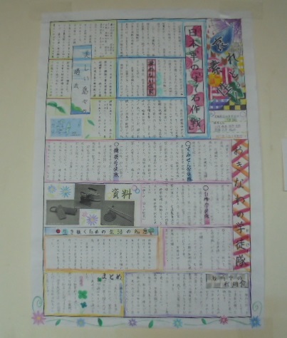 さて、2年生は、来年度修学旅行に向けて、各グループで壁新聞を作成しました。タブレット端末を利用してグループで記事を見つけたり、写真を見つけたりしました。それぞれよく調べていました。