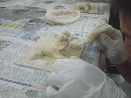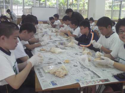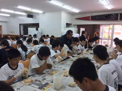 強風のため、楽しみにしていたマリンスポーツ体験が中止になり、シーサーづくりに変更しました。大変残念ですが、子どもたちは楽しそうです。