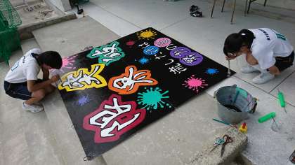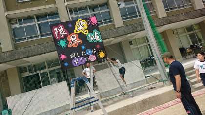 明日の体育大会の準備のため、各種委員会の生徒もそれぞれの持ち場で準備しています。生徒会も看板の準備をしています。