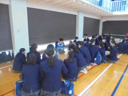 さて、3年生は学年末テストが終わり、午後から私立高校の出願です。昼食後、集会室で、高校に到着した時のマナー、電車でのマナー、歩道でのマナーなど、普段と違う緊張感の中で説明を受けてから、学校ごとで集まり、説明を受けた後、出願に出かけました。出願後、学校に戻ってきて、報告する予定です。