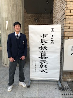 毎年、年末はラグビー、サッカー、駅伝など冬のスポーツとしてテレビでも放映されていますが、本校ラグビー部の生徒が、大阪府代表選手として選出され、全国大会にレギュラーとして出場し、見事日本一に輝きました。2月6日には大阪府知事表彰を受賞し、23日には大阪市長表彰を受賞しました。