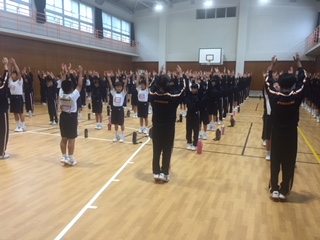 天気は曇りです。朝のつどいとラジオ体操を行います。起きた所で、あくびをしたり、目をこすったりとまだ眠そうです。