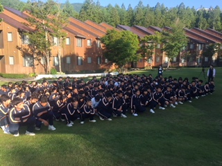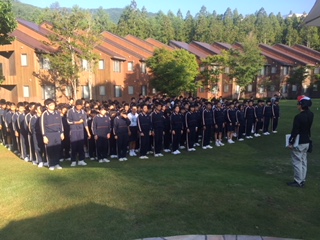 朝のつどいです。昨晩は、10時過ぎにほとんど就寝していました。少し眠そうでしたが、みんな元気です。