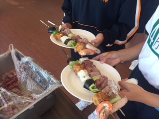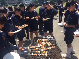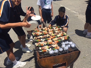 昼食は、バーベキューです。各自が炭火で焼きあげました。じゃがバターとおにぎり、バナナが付いています。