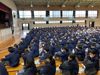 校長先生からは、「健康と安全生活」、「家での手伝い」、「受験勉強、復習、宿題、読書」についての話がありました。他の先生からは、スマートホンの健全な利用等の話がりました。12日間ですが、クリスマス、大掃除、大晦日、正月などいろいろなことがあると思います。計画を立てて、充実した冬休みにしてください。1月7日(月)始業式には、全員が元気な笑顔で登校してください。