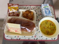 本日の給食は、カレースープスパゲティ、かぼちゃのマリネ焼き、ミニフィッシュ、コッ...