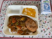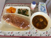 本日の給食は、ビーフシチュー、ベーコンとさんどまめのソテー、みかん、おさつパン、...