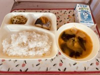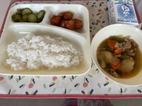 本日の給食は、鶏肉の竜田揚げ、五目汁、キャベツの梅風味、ごはん、牛乳です。 本日...