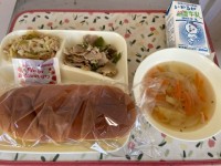 本日の給食は、豚肉のガーリック焼き、ツナとキャベツのソテー、スープコッペパン、イ...