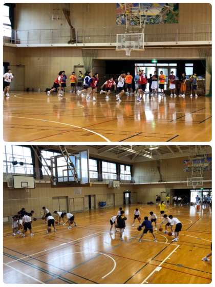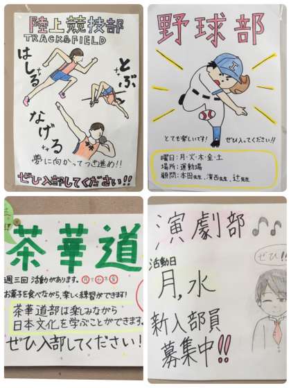 写真は、男子バスケと女子バスケの練習風景と校内に貼られていた新入生勧誘の貼り紙です。