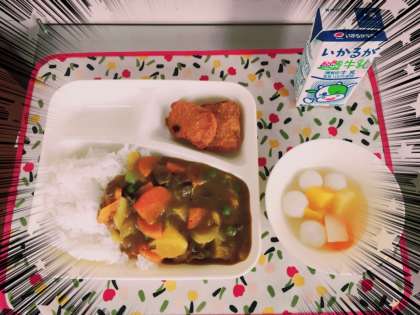 写真は、今日の給食で生徒にも大人気のカツカレーです。
