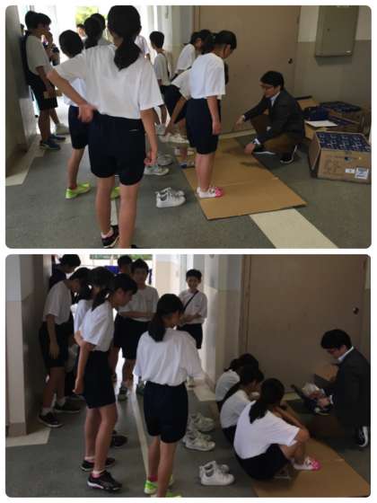 スポーツ用品店の方に来ていただき、自分の足のサイズにあったシューズを選んでもらっている場面でした。