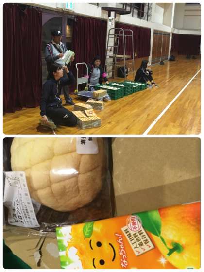 楽しい室内オリンピックの後は、補食としてメロンパンとオレンジジュースをみんなで食べています。