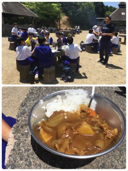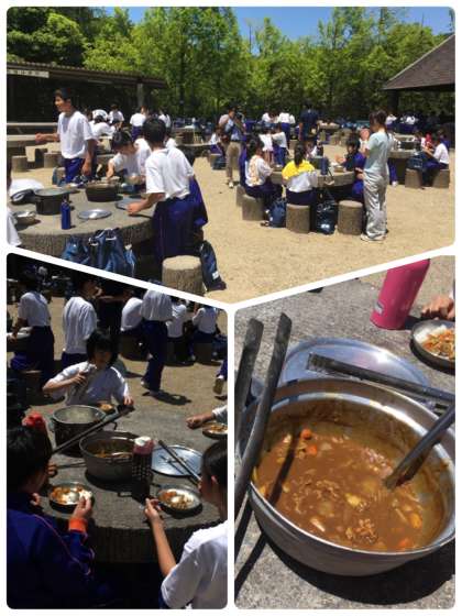 カレー作りの最中にカマドに近づき過ぎて、ケガはないのですが体操ズボンに穴が空いてしまった生徒がいるようです。