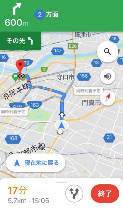中学校の近くへの到着は15:05ごろになりそうです。