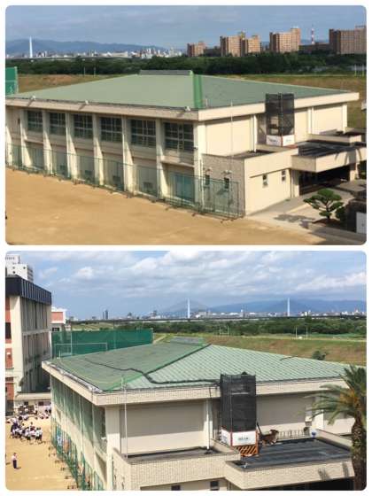 先週から今市中学校体育館屋根に太陽光パネルの設置工事が行われています。