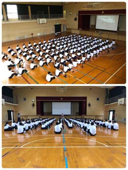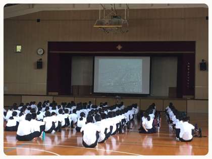 一年生は平和学習を体育館で行っています。