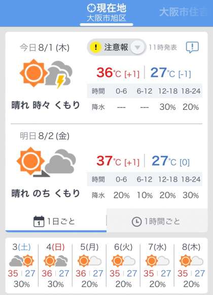 本日、最高気温が36度予想。明日は37度予想となっています。