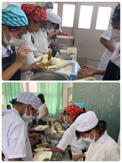 【2枚目】今日は、カツカレーだったこともあり、2枚目はおかわりのじゃんけんをしているところのようです。【1年2組】