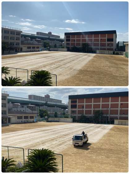 昨年までは、生徒の皆さんに手伝ってもらっていたとのことですが、今年度から車で機械を使って散布していただくことになりました。