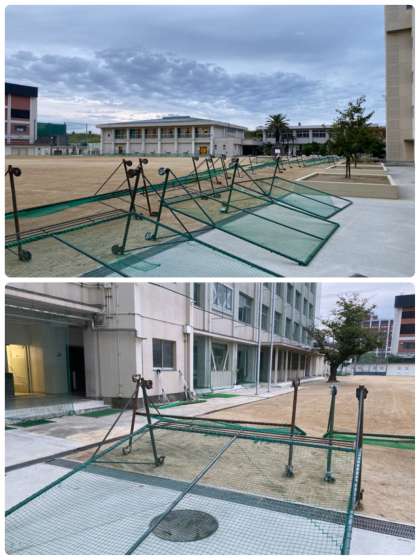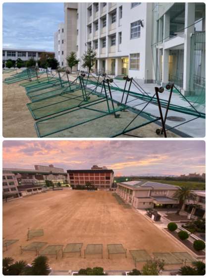 中学校でも台風に備えて、防球ネットを倒したり戸締りをしました。