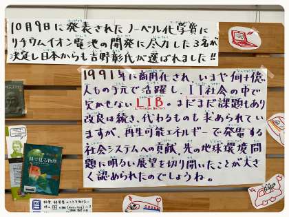 また、図書館補助員の宮尾さんが素敵な掲示物をつくってくださっていました。