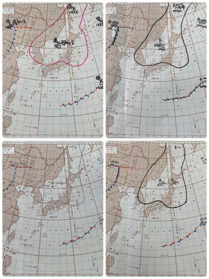 発展として、ラジオの気象通報から天気図の一部分を作成しました。