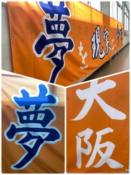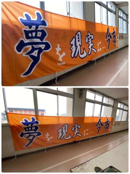 陸上部山川先生の希望で、陸上部だけでなく全ての部活動が頑張れるような応援用の横断幕にして欲しいとのことで、このデザインになりました。