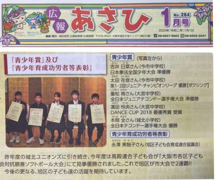 旭区の広報誌の「広報あさひ1月号」にて、本校生徒が大阪市の「青少年賞」の表彰を受けた記事を掲載していただいています。