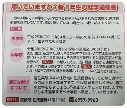 また、令和2年度の新入生の方に区役所から就学通知書が送付されていますという記事が掲載されていました。
