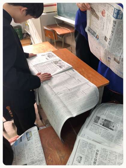 1年社会科の授業では、毎時間、新聞記事を利用して、少しずつ時事問題を扱っています。