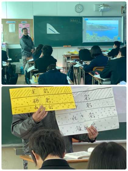 地層に関する授業で、「隆起」や「沈降」といった言葉の説明から海岸段丘の成り立ちなどについて学んでいました。