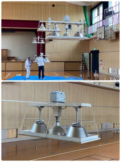 今日は、朝から体育館の照明のLED化工事が行われています。