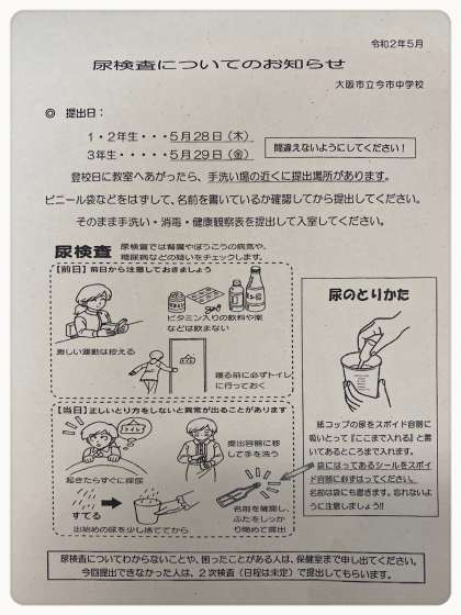 また、両日ともに午前と午後に分かれての分散登校となりますが、できるだけ朝起きてすぐの尿を採取してください。