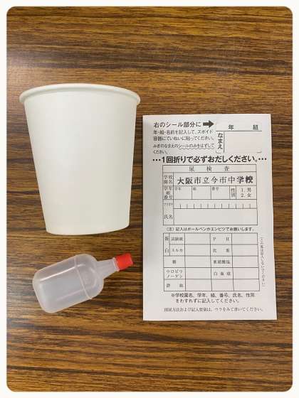 2枚目の写真にあります検尿セットを3年生には昨日5月25日【月】、1・2年生には本日5月26日【火】に配付いたします。
