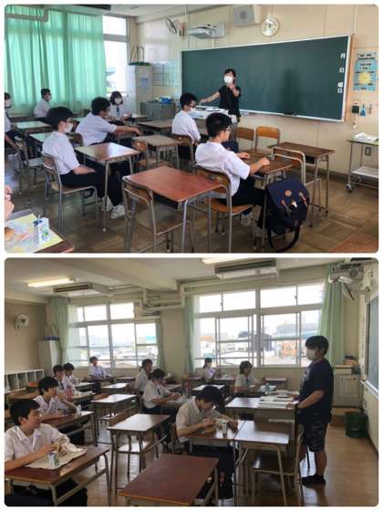 今日は給食の時間の様子をお伝えします。給食の時間は、コロナウイルス感染拡大防止のため自分の席で前を向いて食べています。いつもなら班にしてお互い楽しく食べているところですが、今はしばしの我慢です。