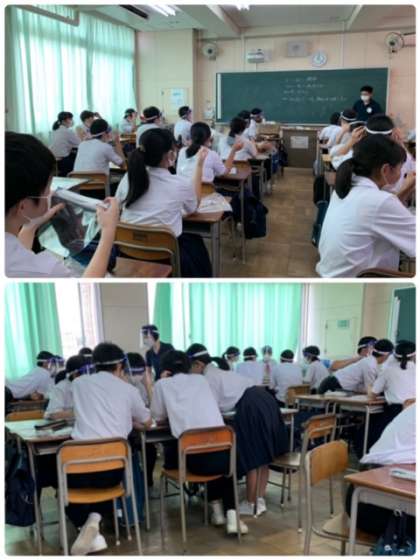 学活では班活動を行いましが、対面しての話し合い活動だったため、フェイスシールドを着用して取り組みました。