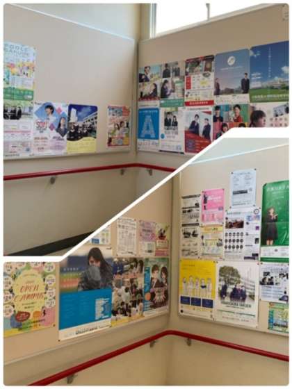 校舎の掲示板には、すでにいくつかの学校の紹介ポスターが貼ってあります。