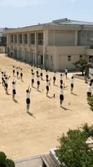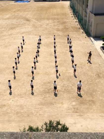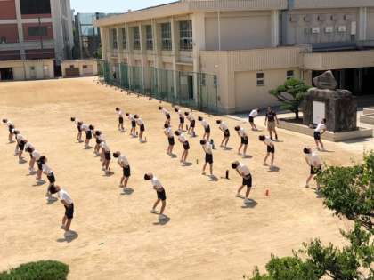 前後左右と、人との間隔を空けた中、キビキビとランニングやラジオ体操などをしています。