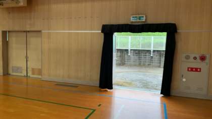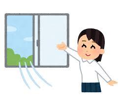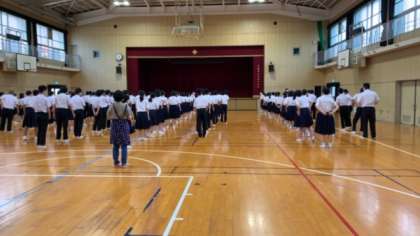 窓やドアを開け、体育館を換気した中での学年集会です。