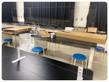 新型コロナウイルス感染症予防の観点から、懇談の際にアクリルのパーテーションを全ての教室に準備させていただきました。2枚目の写真の物になります。