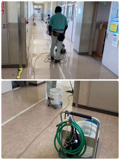 学校再開に向けて、今日は本館廊下の2階から4階を清掃業者さんにお願いして綺麗にしていただきました。