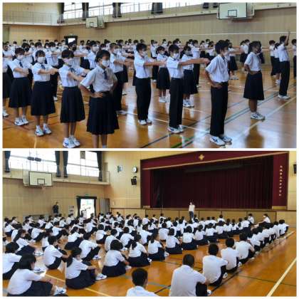 これまで行なってきた行事も形を変えての実施になることが増える。その中で、いかに頑張れるか。先日、合唱コンクールの曲決めや指揮者などの役割分担をしたと思うけど、本番だけが行事じゃなく、勝負はすでに始まっている。これからもっともっと、いろんな役割を担っていったり、活躍する場面が出てくる。そんな時こそ、前向きに頑張ろうとしていけば、きっと社会に出たときに役立つ生きる力となるはず。様々な制限がある中ではあるけれど、いつの時も前向きに頑張れる2年生でいてほしい。」